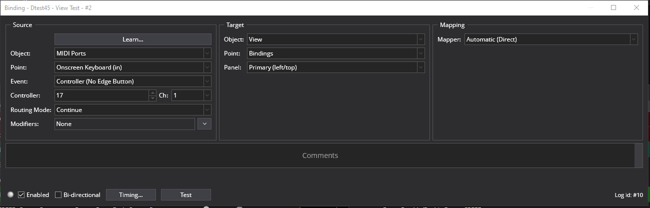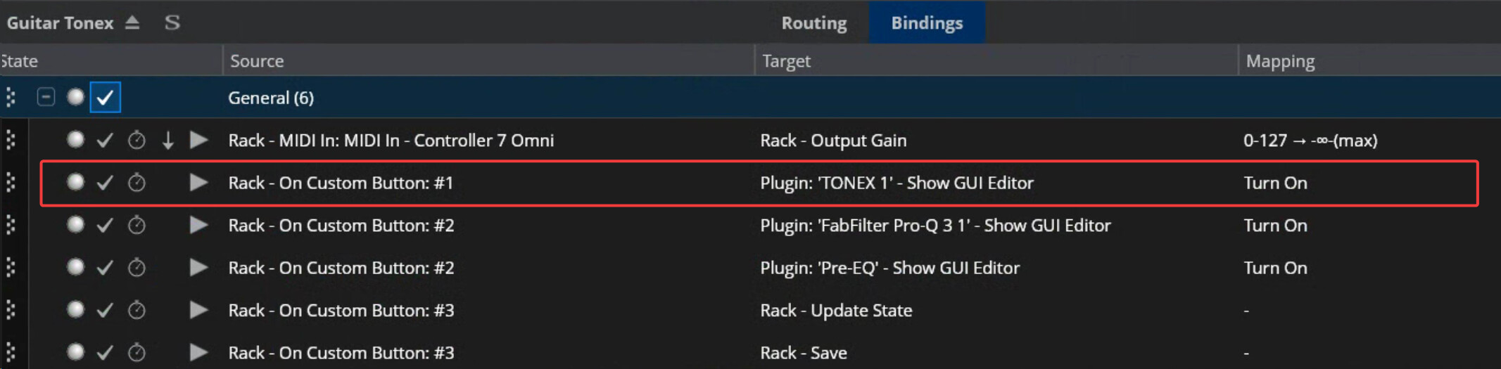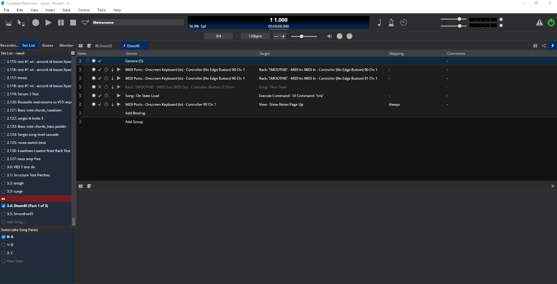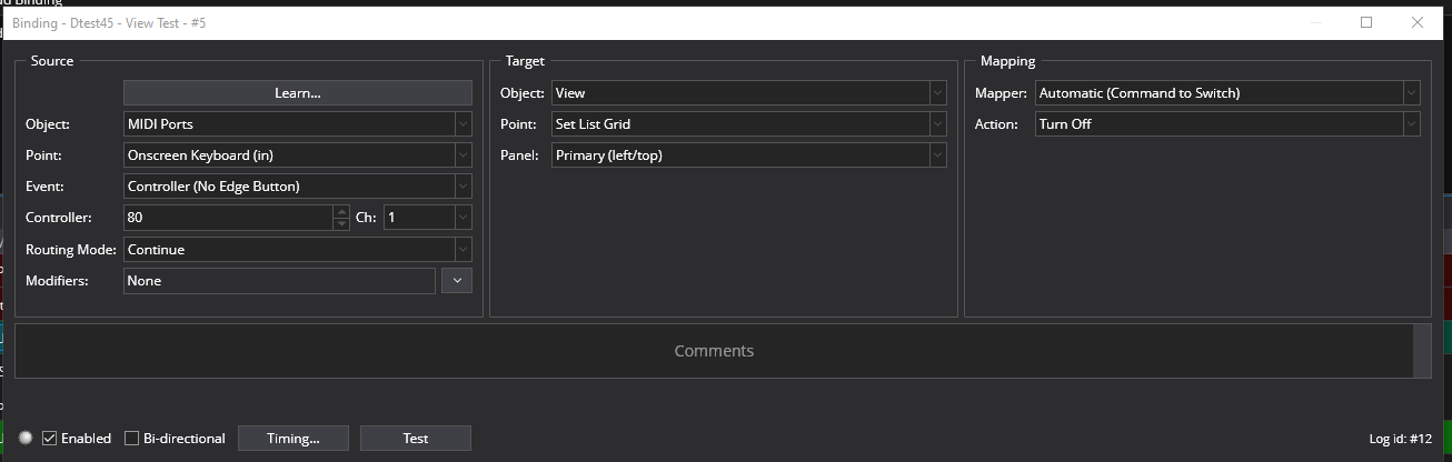 In my test song I’ve been using I first set up a new controller bar with the common 6 CC buttons momentary buttons. Then I set up 6 bindings to exercise the view functions for the new tab systems.