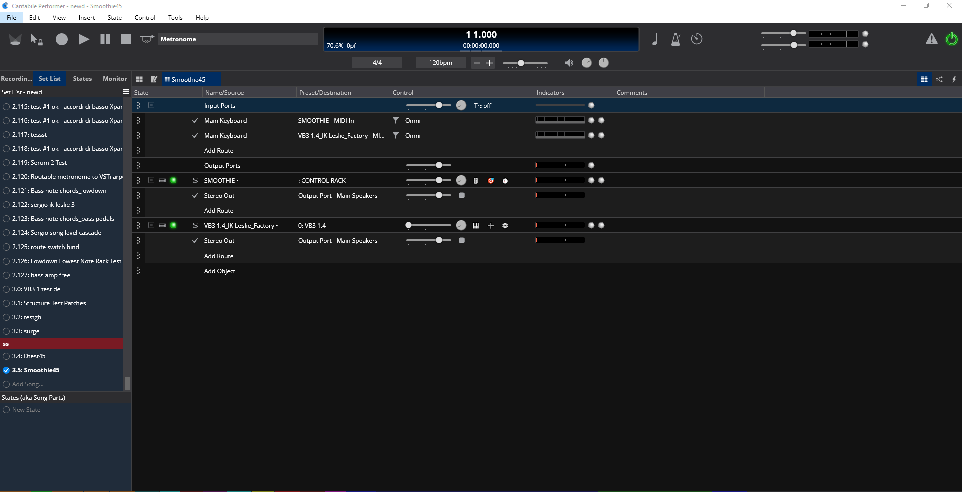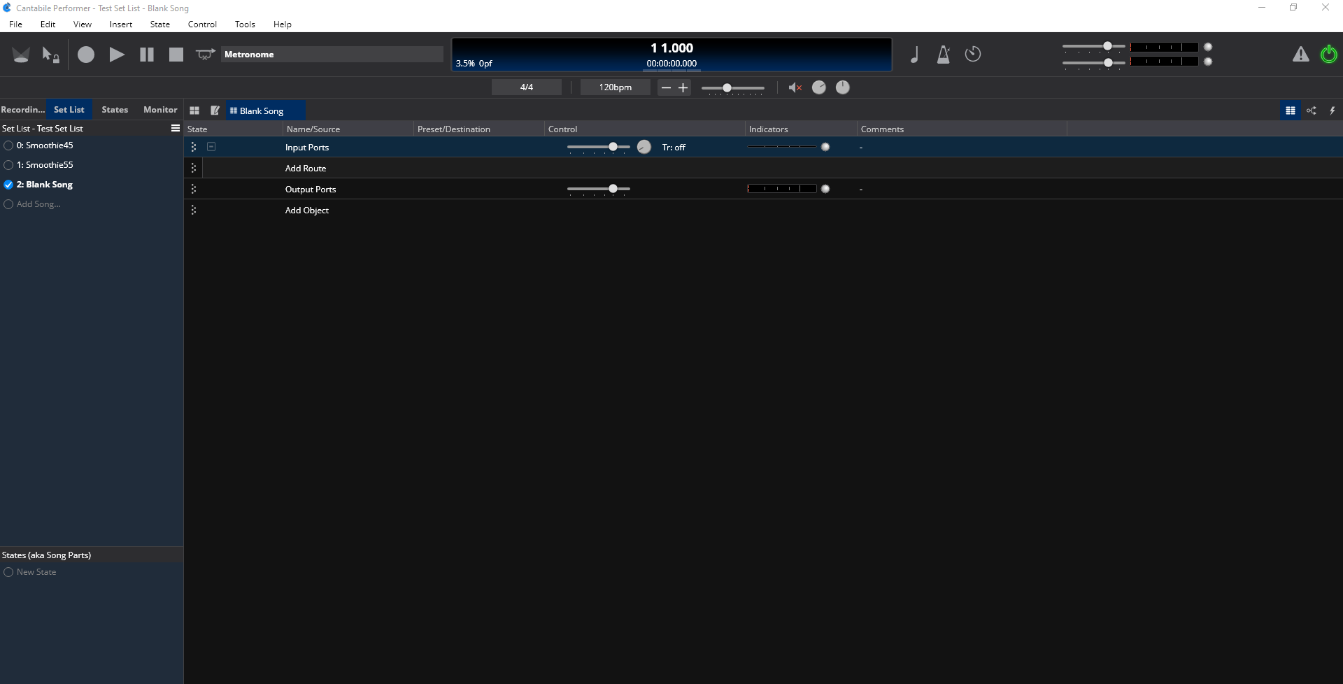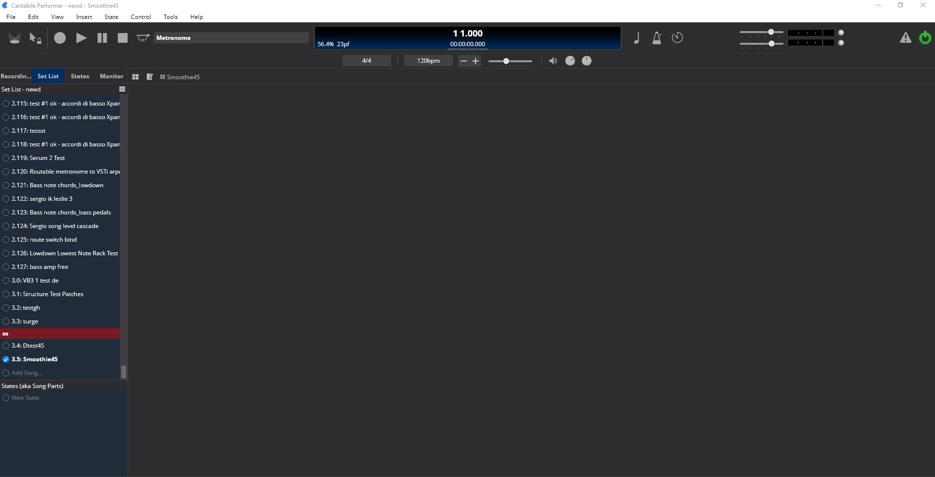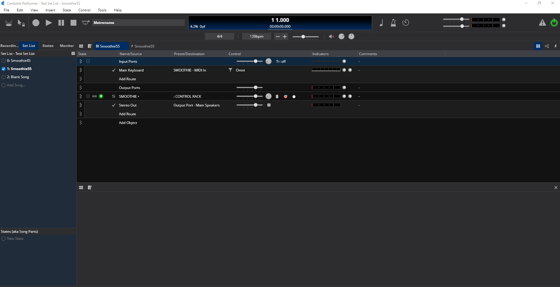 After switching to the next song in the set list that also has Smoothie loaded in it the primary song panel goes blank even without the lower panel and tab set being established in that song.