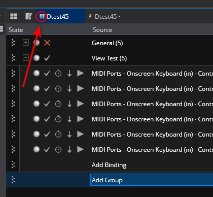 and after it is switched to the bindings view on the same tab the view changes but the icon remains the same. This self corrected after I came back to it in a different testing session and has been working ever since then for several sessions.