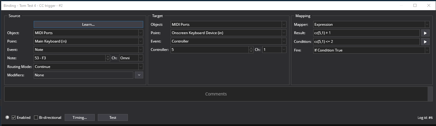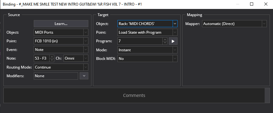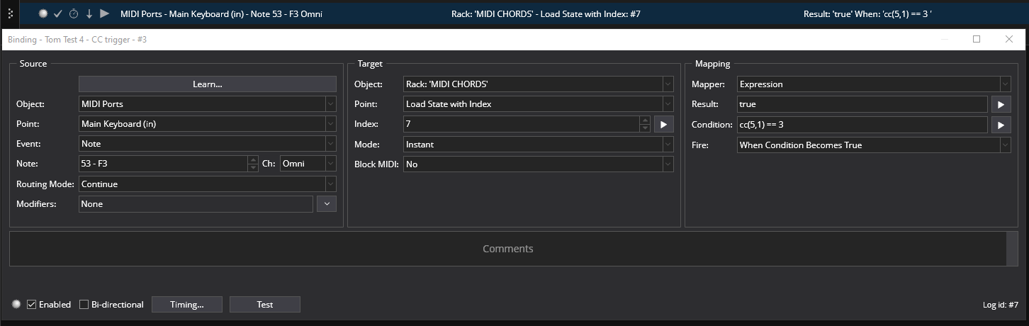 I’m using Midi Chords vst to play a harmony line from a monophonic source (EWI). It’s all good but I need to invoke the #7 Rack State in Midi chords on the 4th time I play a note. In this example it’s note 53 - F3. I’m wondering if the new bindings provide a way to do that?