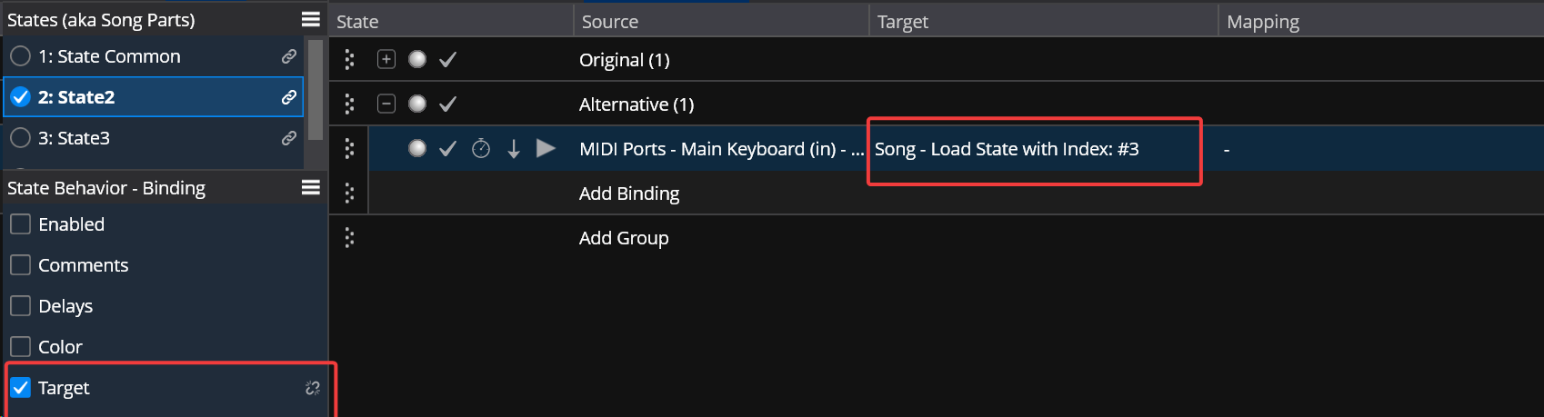 Making Target state-dependent means that you can have an individual target value for this binding for EVERY state in your song, not just toggle between 2 and 3.