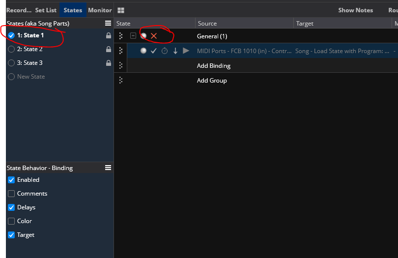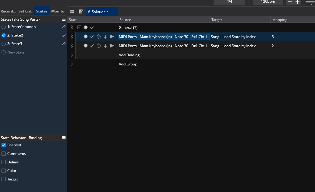 There’s always multiple ways of doing things in Cantabile - having multiple bindings with their “enabled” property state-driven certainly works, and it can be more transparent at first glance, but once you want to customize things for a larger number of states, making a binding target state-dependent is far more economical and less error-prone.