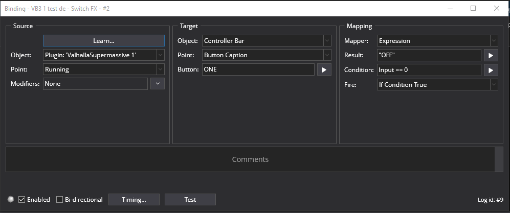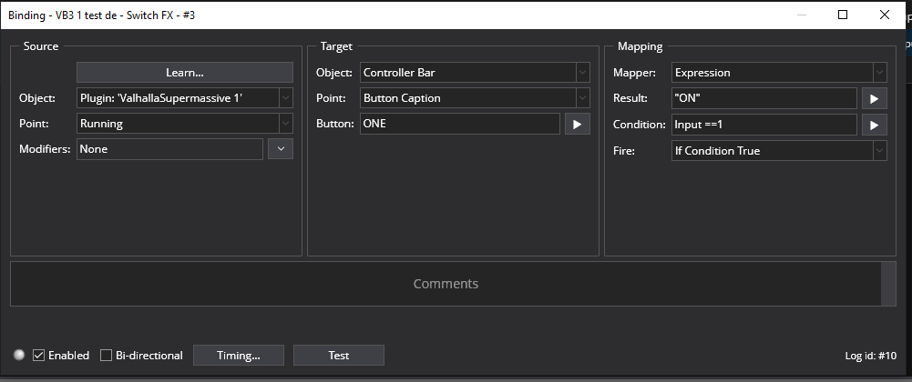 Regarding your question I do have some thoughts. For starters a good approach to this issue is for you to use a momentary style switch on the FCB 1010. In Cantabile it is referred to as a No Edge Button. Mechanical toggle switches can be a bear to keep synced in Cantabile whereas the momentary type are more friendly. So once that’s established you could have a single binding that addressed the toggling of the FX switch (I assumed the running switch for this example). Since the Run and Bypass Mode is checked for the FX plugin (Valhalla Supermassive) it will remember the last state is was and return the value instantly on a state change. The FCB 1010 momentary switch will toggle the current value of the Run and Bypass Mode no matter it’s state on the first press.