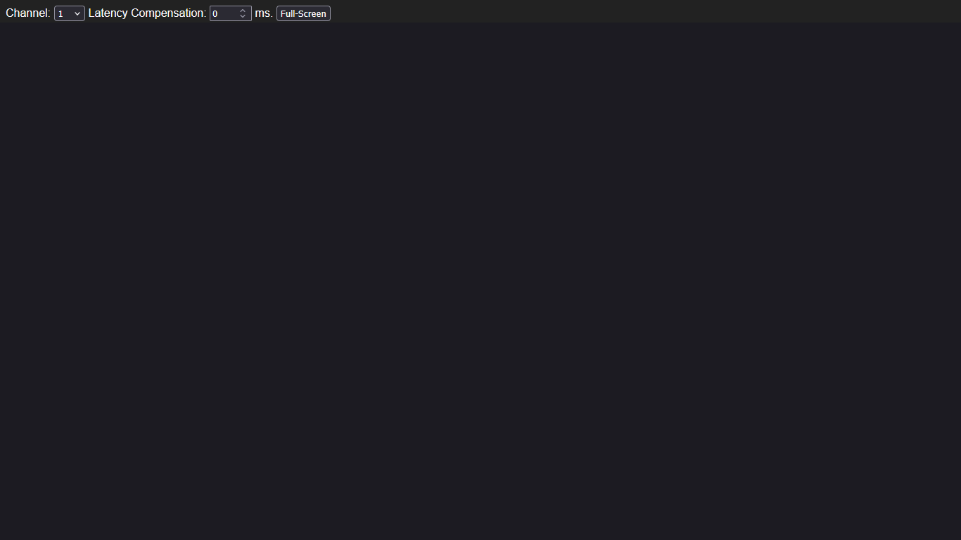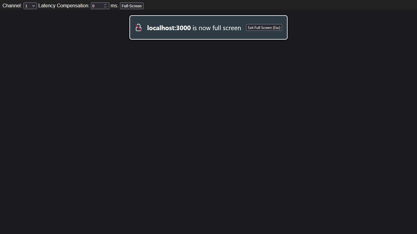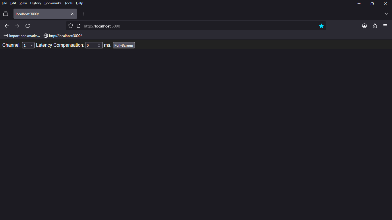 localhost:3000 in Firefox is showing a screen with Channel, Latency Compensation and ‘Full-Screen’ options.