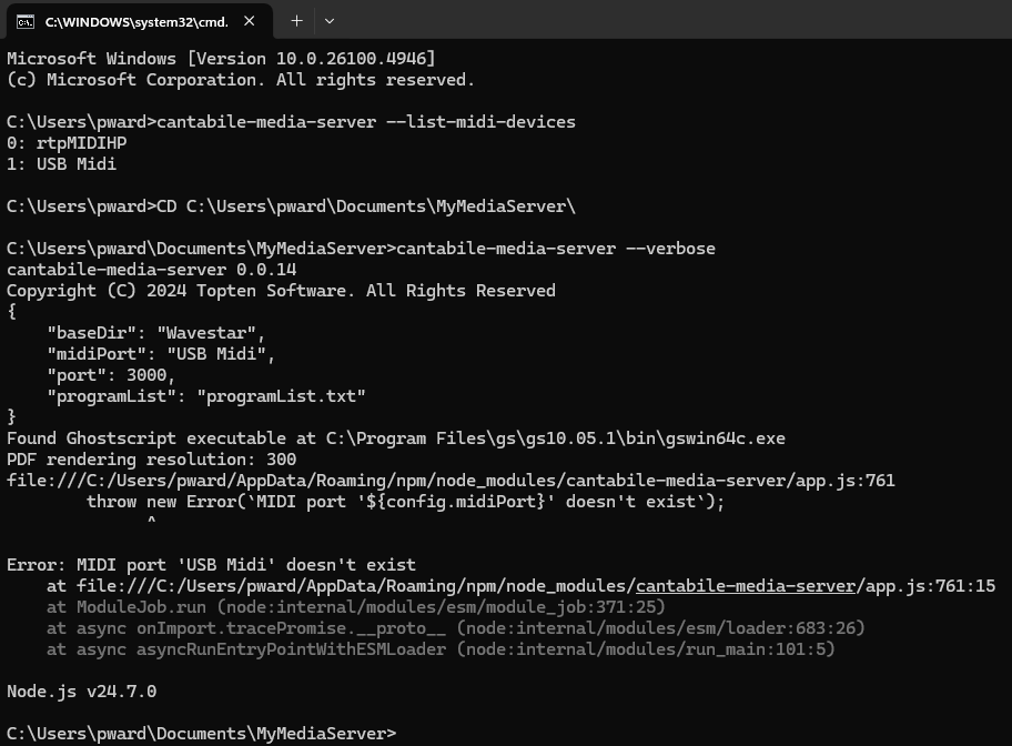I tried creating ports in loopMIDI and running Media Server with them named in the config.json… Ports without spaces in their names work - ports with spaces in their names fail.