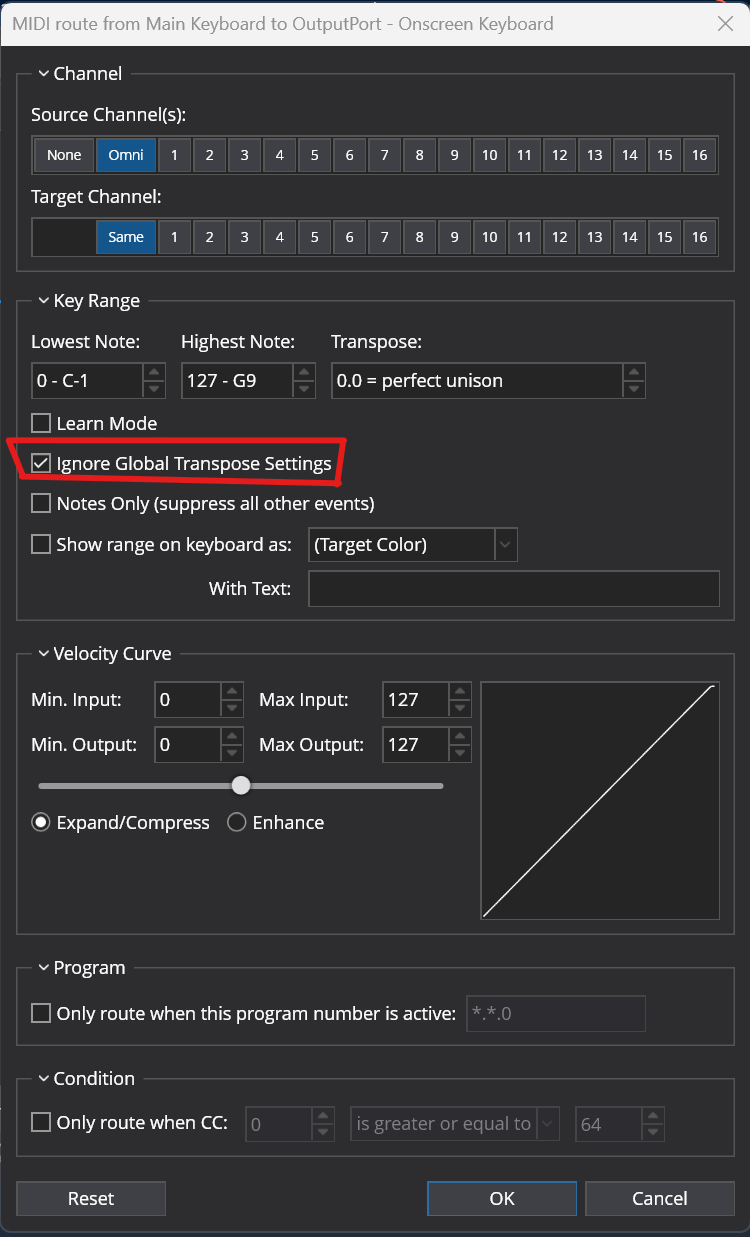 If you’re using Cantabile v4307 or later, you can use the new “apply global transpose in MIDI filter” feature to solve this. Here’s how: