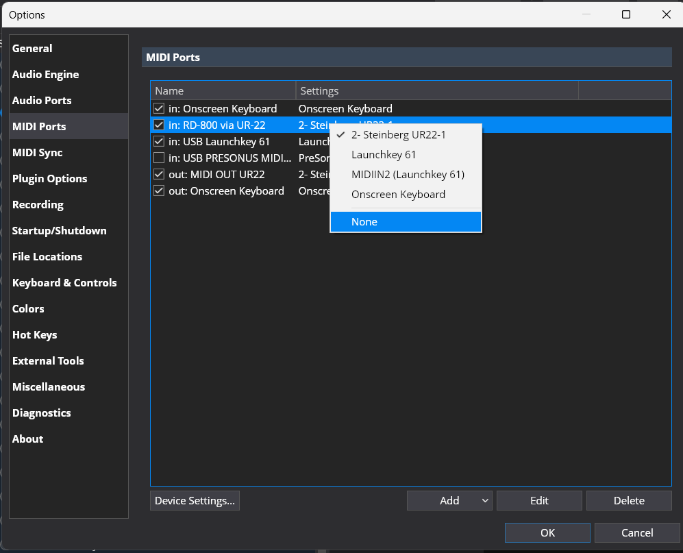 Since my last concert in November 2025, I’ve taken a long break and haven’t used Cantabile. I’m reconnecting my entire studio. I have a Novation Launchkey 61 connected via USB and an RD-800 connected via DIN (IN and OUT) to a UR-22 MK1, which is also connected to my PC via USB. This configuration has been used for several months without any problems.