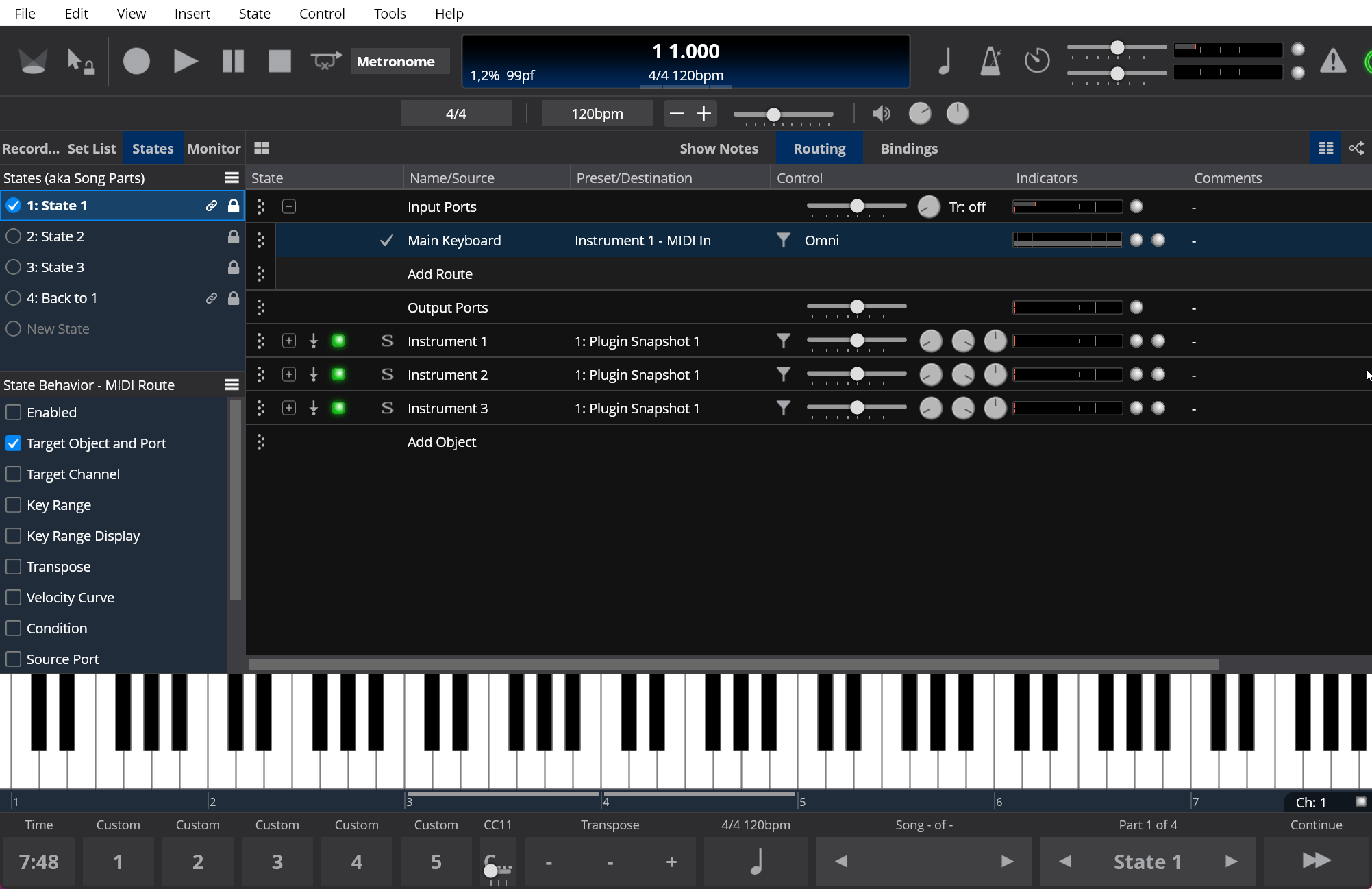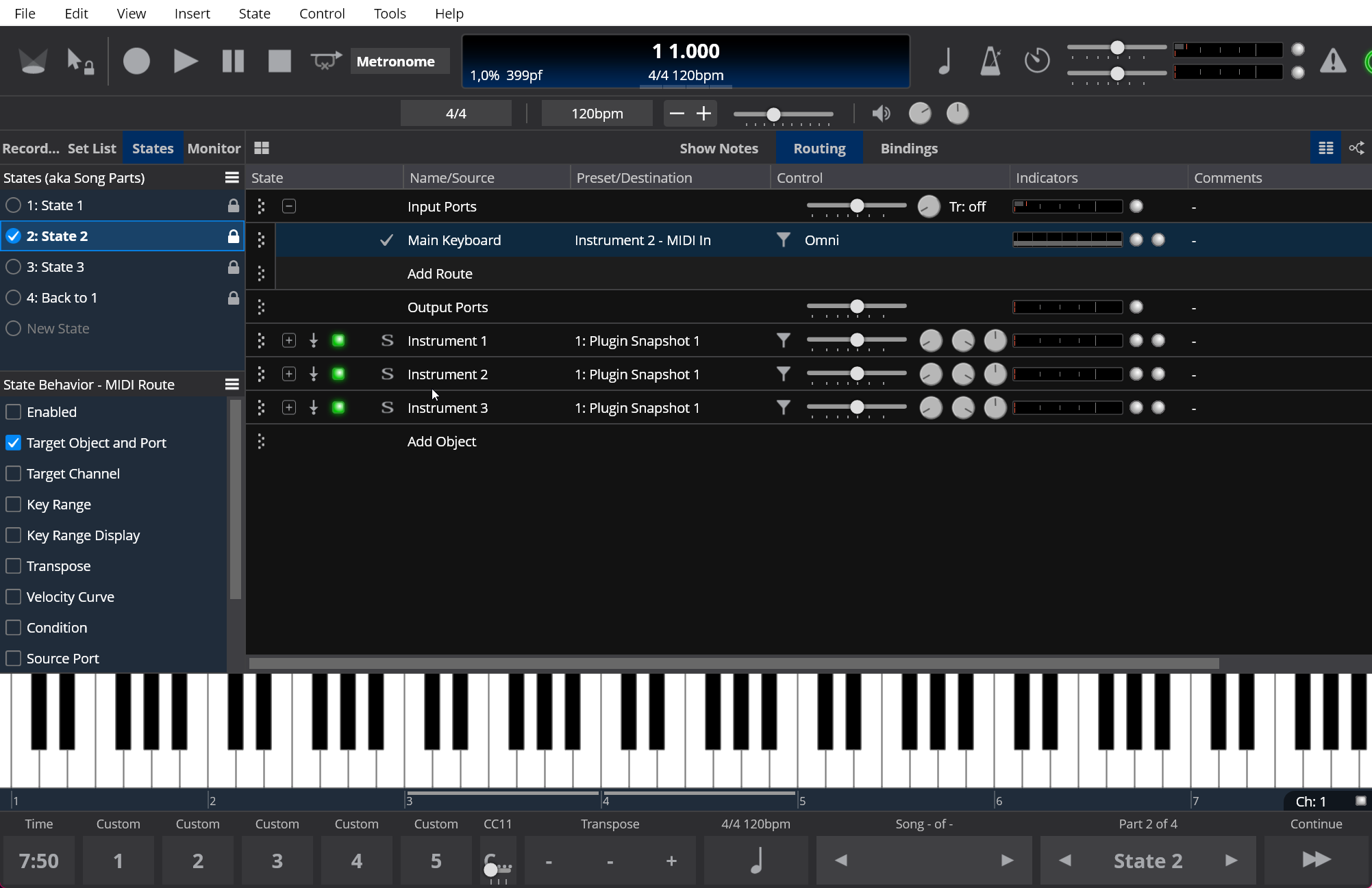 Using State Behavior = “Target Object and Port” means for every song state, the route from Main Keyboard gets sent to a different plugin; for State 2, this looks like this: