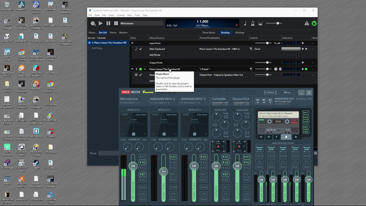 Thanks , Want to know how to add my microphone and piano on the same song in cantabile software, I am using Sample tank 4 for my piano plugin , and using Berringer Q502usb interface for my microphone to voice meter.